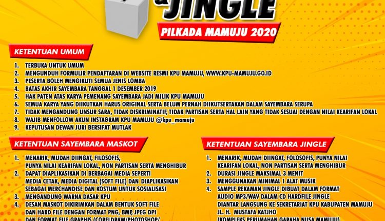 TELEGRAPH.ID, MAMUJU – KPU Mamuju membuka sayembara maskot dan jingle Pemilukada Mamuju tahun 2020. Sayembara dibuka hingga 1 Desember 2019.