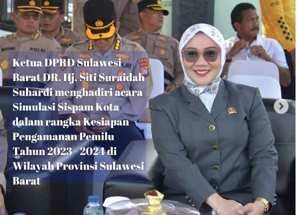 TELEGRAPH.ID, MAMUJU – Ketua DPRD Provinsi Sulawesi Barat DR. Hj. St. Suraidah Suhardi SE., M.Si menghadiri acara Simulasi Sispam Kota dalam rangka Kesiapan Pengamanan Pemilu Tahun 2024 di wilayah Provinsi Sulbar di Jalan Yos Sudarso depan Hotel Maleo Mamuju Rabu, 11 Oktober 2023.