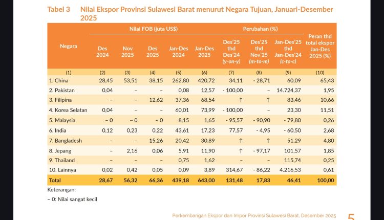 TELEGRAPH.ID, MAMUJU – Kinerja perdagangan luar negeri Provinsi Sulawesi Barat menunjukkan tren positif sepanjang 2025. Nilai ekspor Sulbar tercatat mencapai US$643,00 juta atau naik 46,41 persen dibanding periode yang sama tahun 2024.