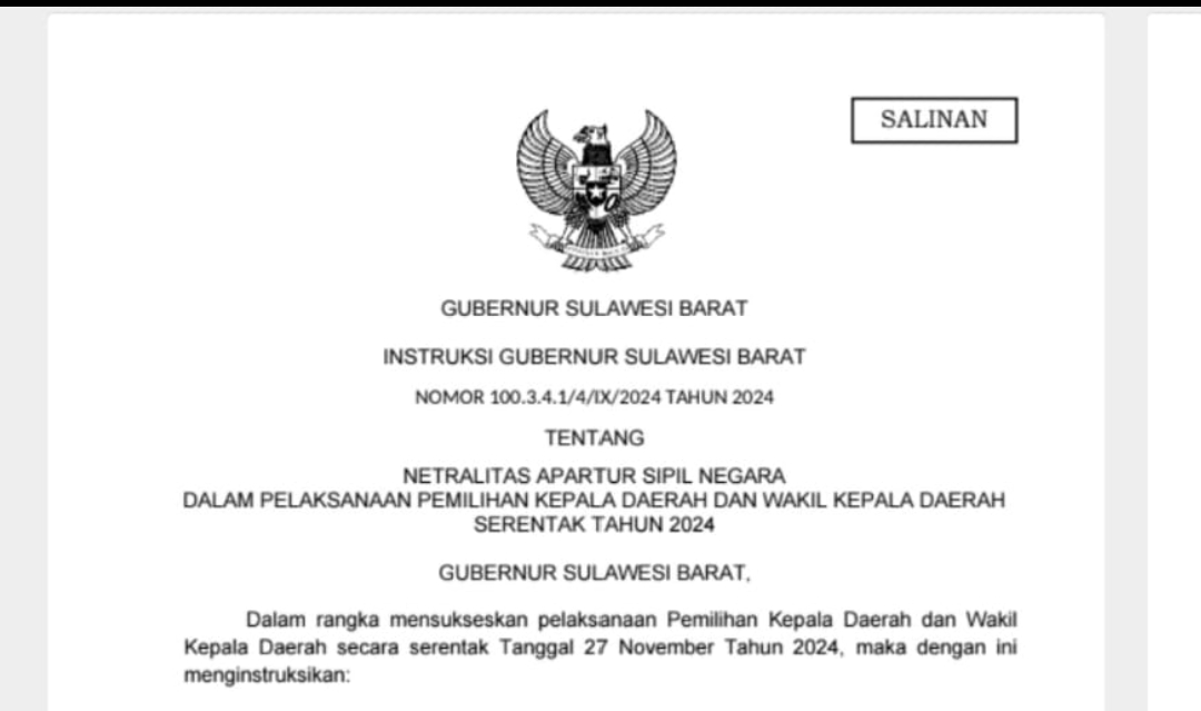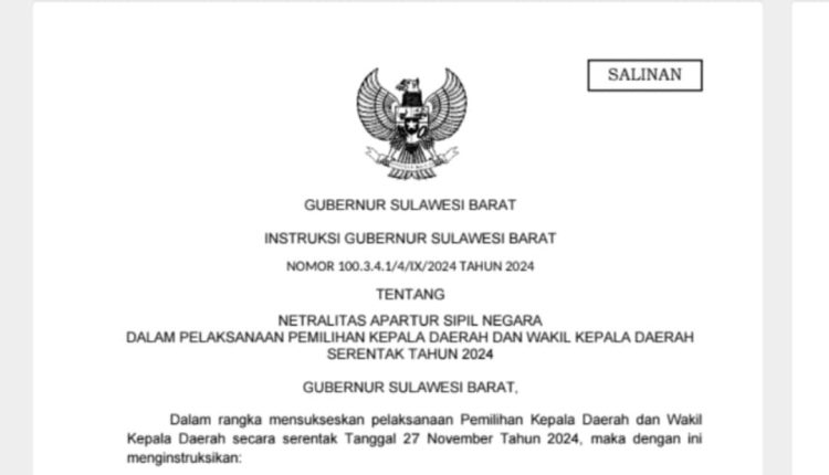 Hal ini ditegaskan melalui Surat Instruksi Gubernur Sulawesi Barat Nomor 100.3.4.1/4/IX/2024 Tahun 2024 tentang Netralitas Aparatur Sipil Negara dalam pelaksanaan Pilkada Serentak 2024 mulai berlaku per tanggal 25 September 2024.